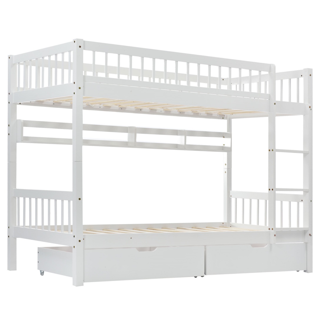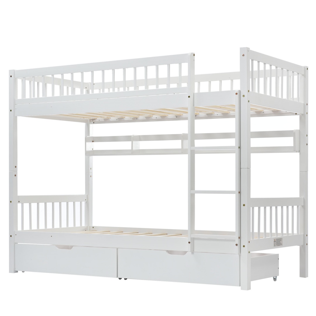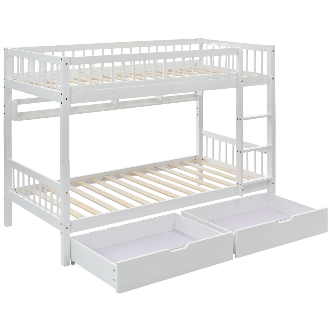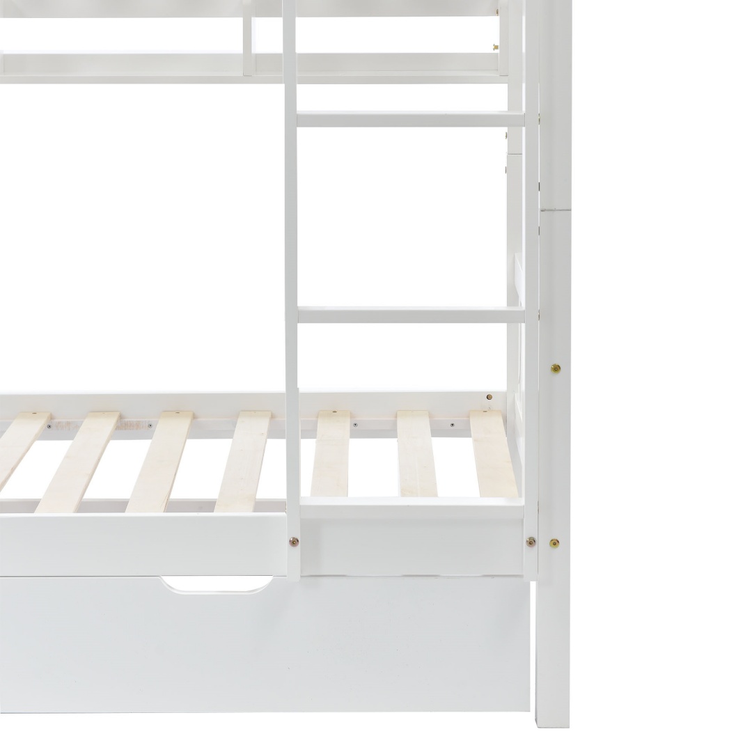 Bunk Bed, Kids Children, 3FT Solid Pine Wood Single Bed Frame & Under Bed Slide Drawer Storage, With Shelf, White 90x190cm
