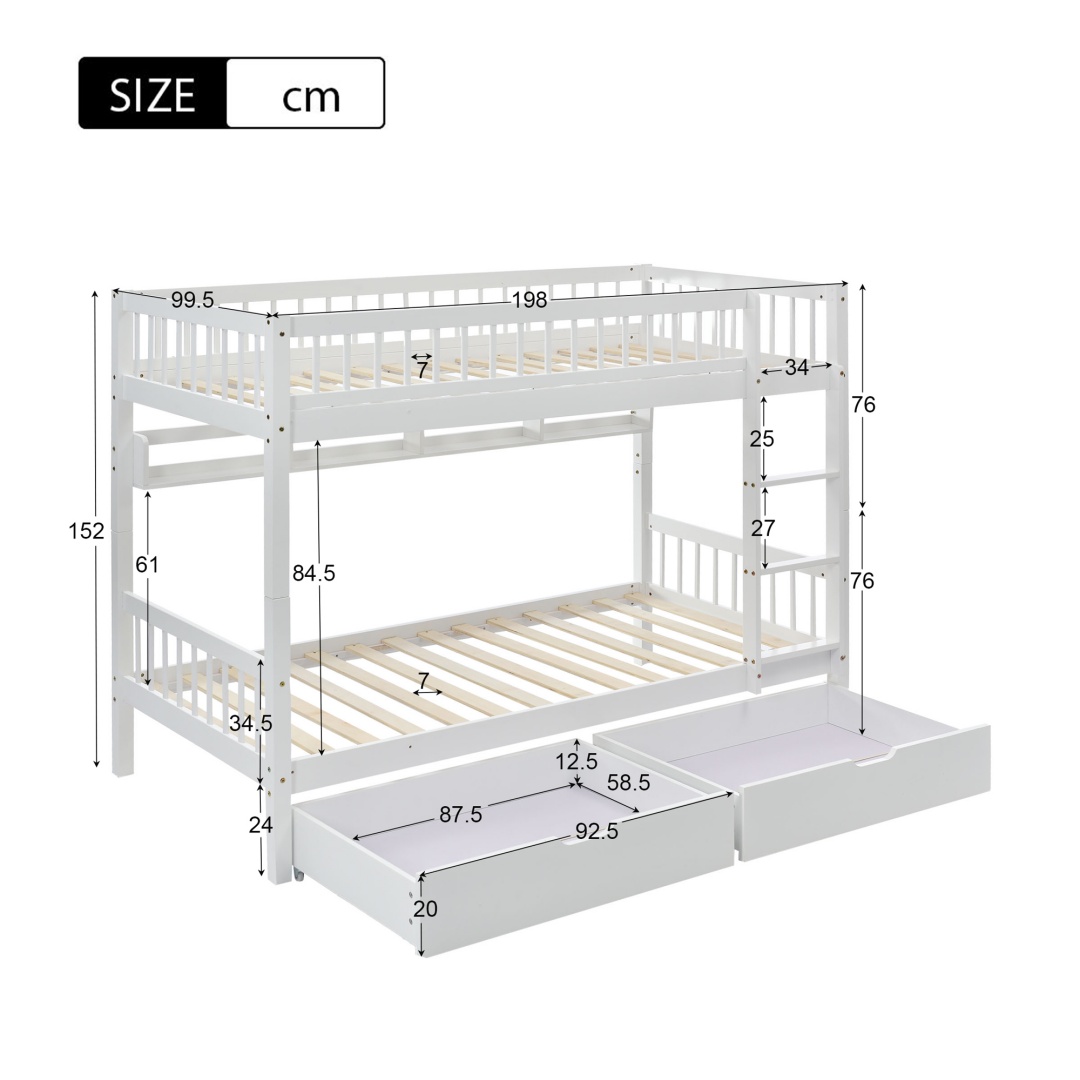 Product Name:Bunk Bed, Kids Children, 3FT Solid Pine Wood Single Bed Frame & under Bed Slide Drawer Storage, with Shelf, White (90x190cm)