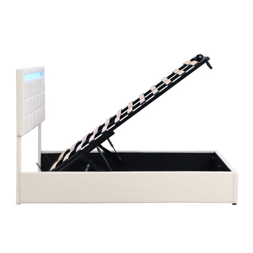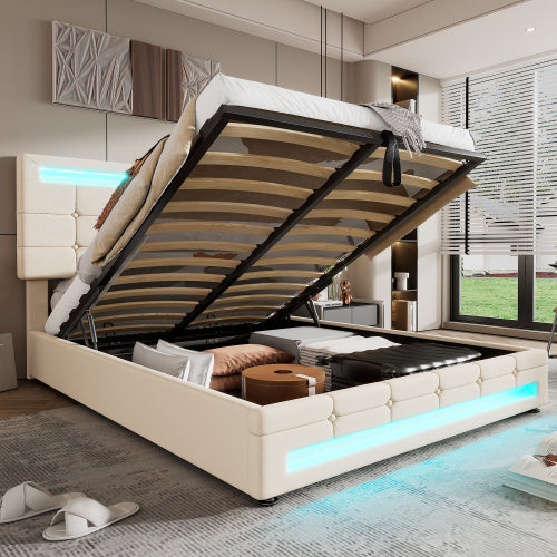 Upholstered Bed, Hydraulic Bed, Adults Teenagers 4ft6 Double Bed 135x190cm, Square Embellishment, With 7colors LED-light Strips, Velvet Iron, Beige